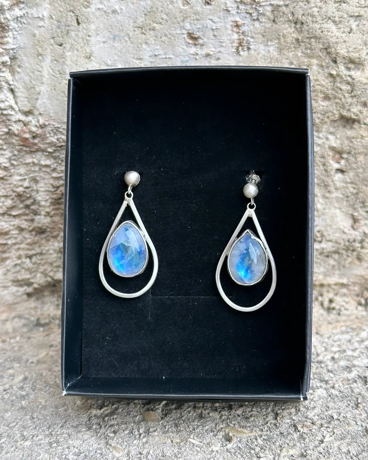 En severek kullandığım küpelerim. Ay taşını çok seviyorum. Hem beyaz hem mavi oluyor. Yanarlı, dönerli bir ışıltısı var. Bu büyüklükte o ışıltı çok daha net görülüyor. Sallanan bir küpe olduğu için ışıltı daha kolay dikkat çekiyor. Kendimi enerjik ve canlı hissetmemi sağlayan çok severek taktığım küpe takımım.