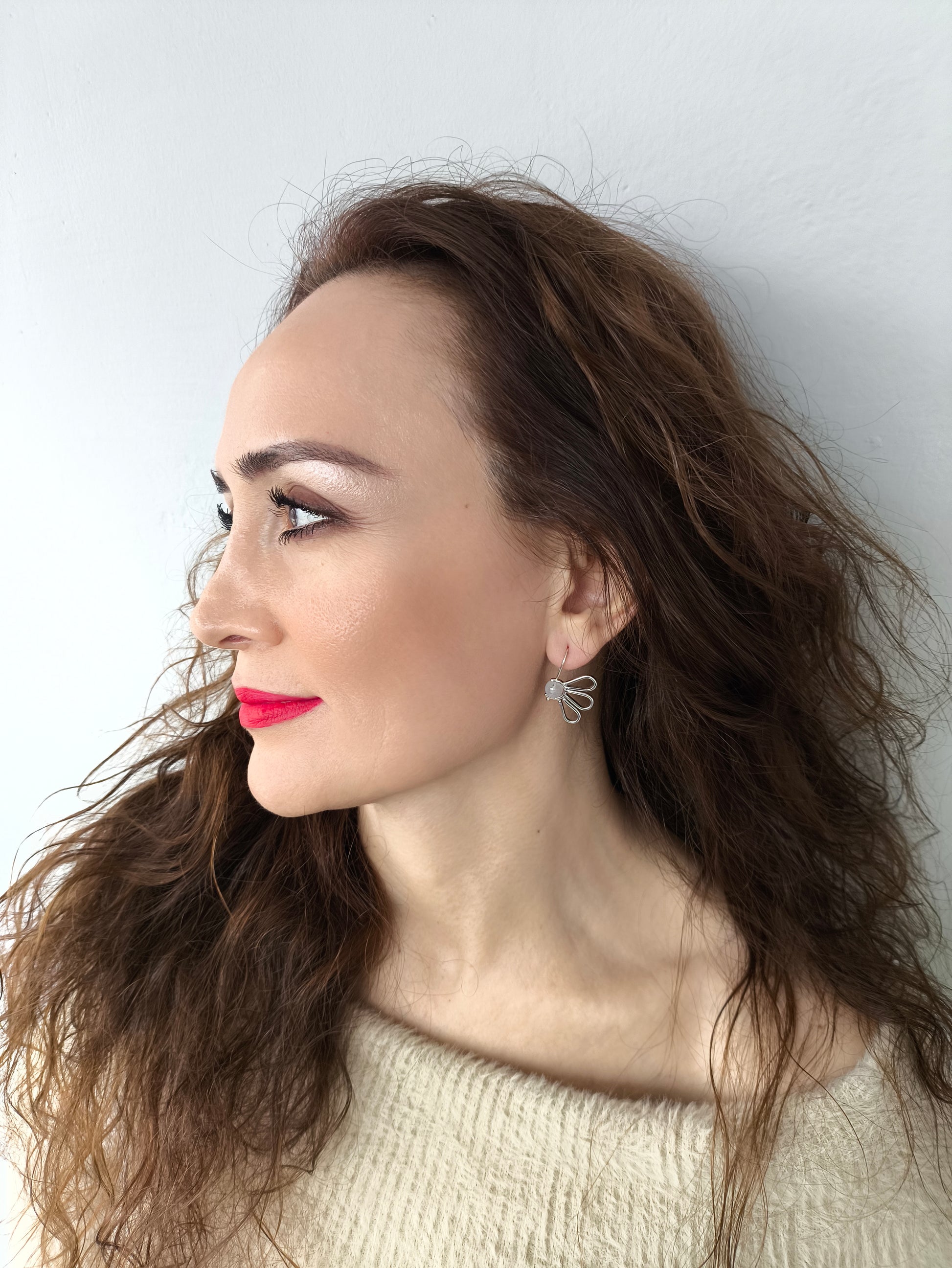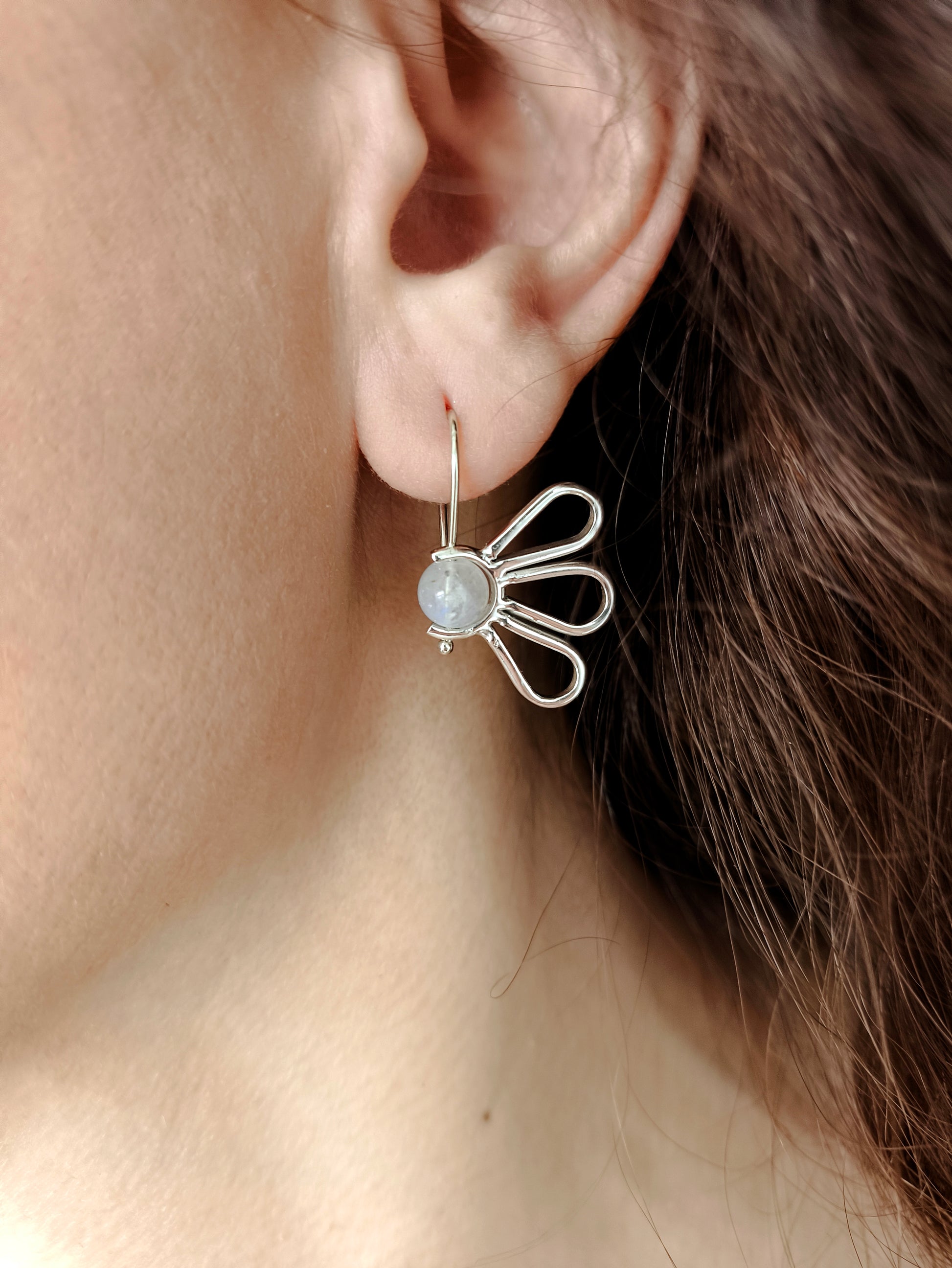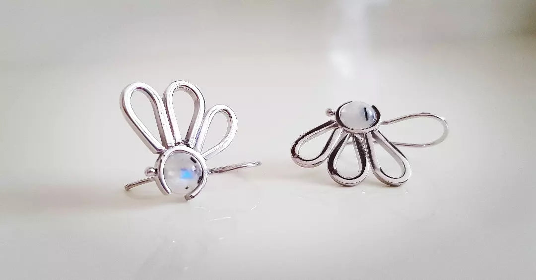 Papatyayı çok severim. Ay taşıyla birleşince daha çok seviyorum. Elimi taşa dokundurup kendi çevresinde döndürüp oynuyorum. Kulağımda bu küpelerim varken baharı, yaşam enerjisini, mutluluğu daha çok hissediyorum. Bir tekini kaybettiğimde öyle çok üzülmüştümki Seyhan bana bir tane tek yaptı ayrıca. Bunun için elimde kalan küpeyi istedi, çünkü her küpe tek tek kendi boyutlarında yapılıyor. Eş olabilmesi için aynı boyutlarda tekrar yaptı. En sevdiğim ❣❣❣